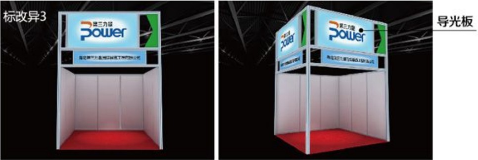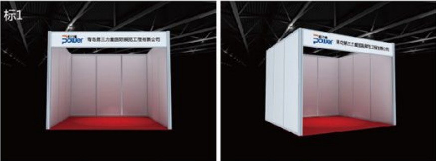 標準展位配置:圍板、楣板、日光燈、1張洽談桌,2把椅子,220V電源插座,1個垃圾簍;楣板字為參展企業公司名稱
